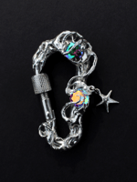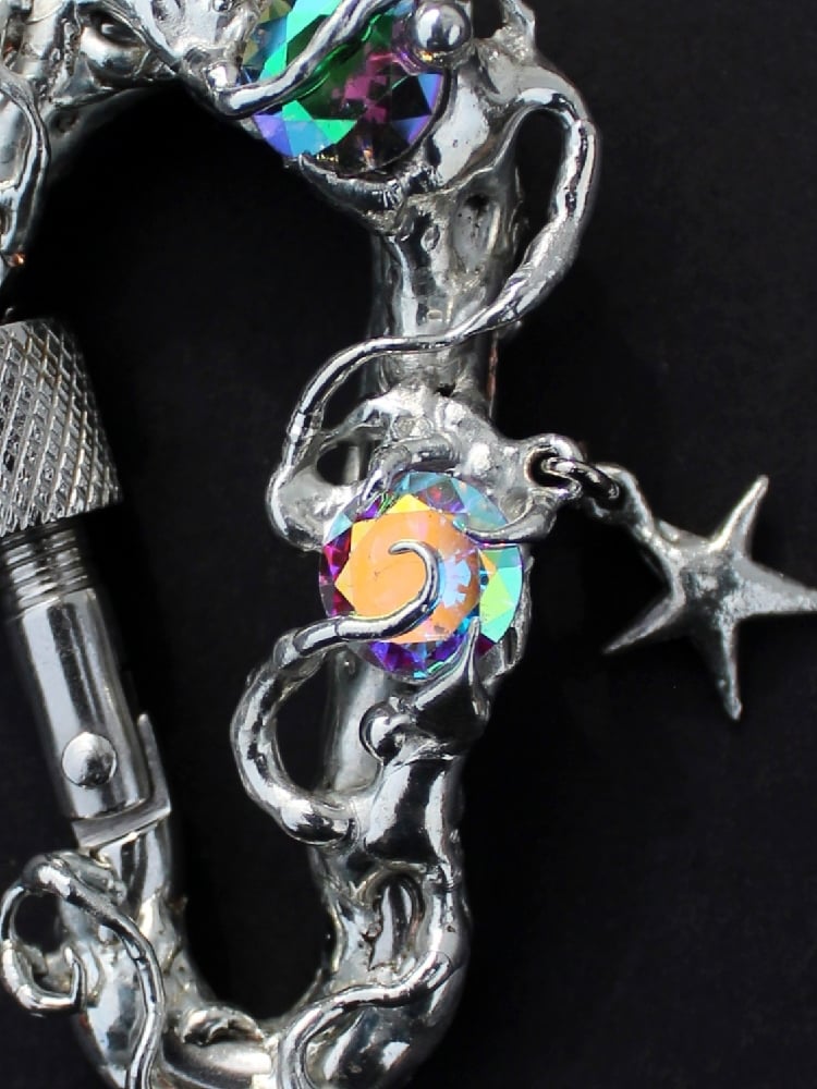 An artisanal organic-style carabiner, handcrafted from stainless steel and lead-free pewter. The design features two meticulously set, round faceted holographic crystal gems that display an iridescent play of colors. A unique, hand-sculpted star charm is also attached to the carabiner.