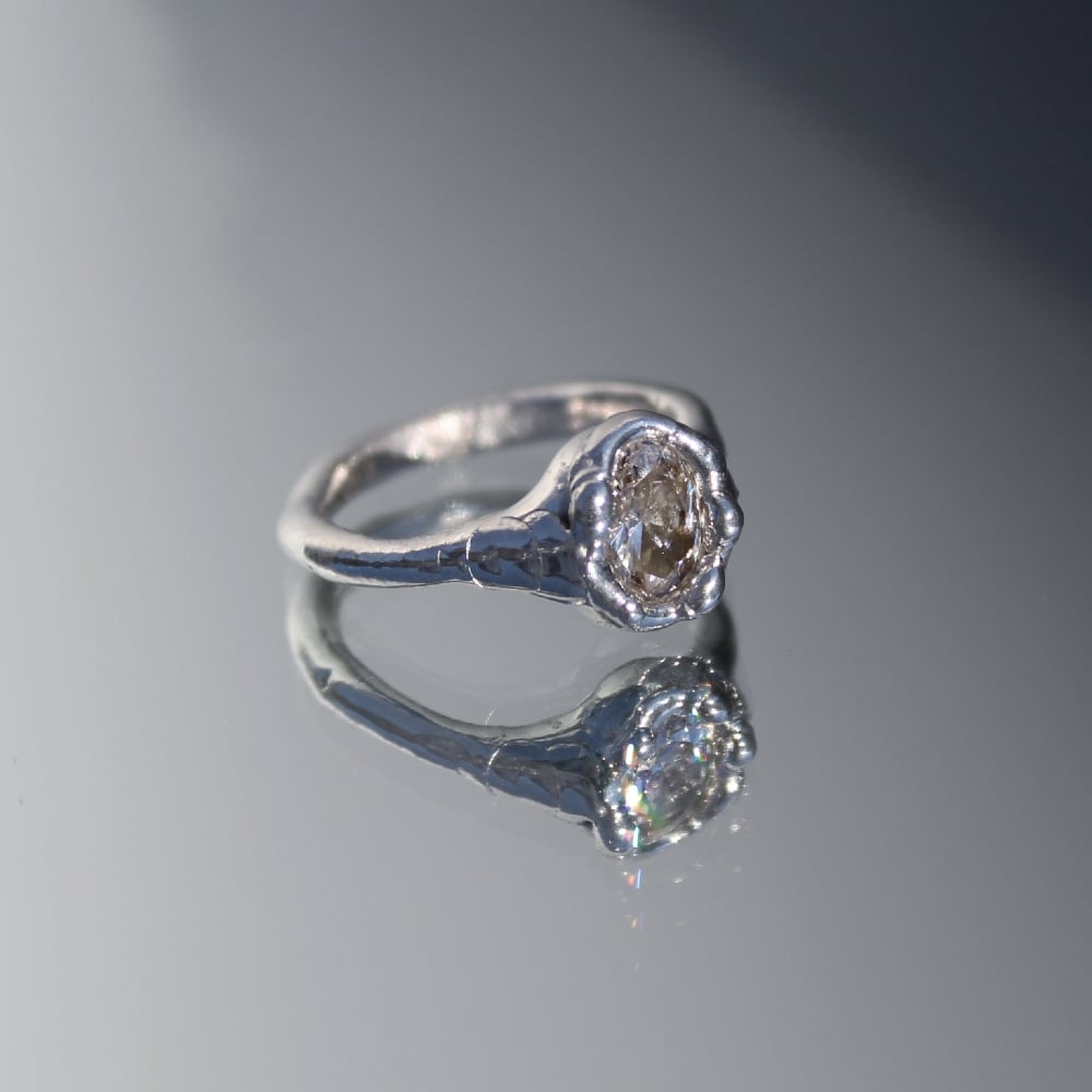 Handmade one-of-a-kind ring crafted from fine pewter with a smooth, mirror-polished finish, featuring a sparkling and transparent oval cubic zirconia.