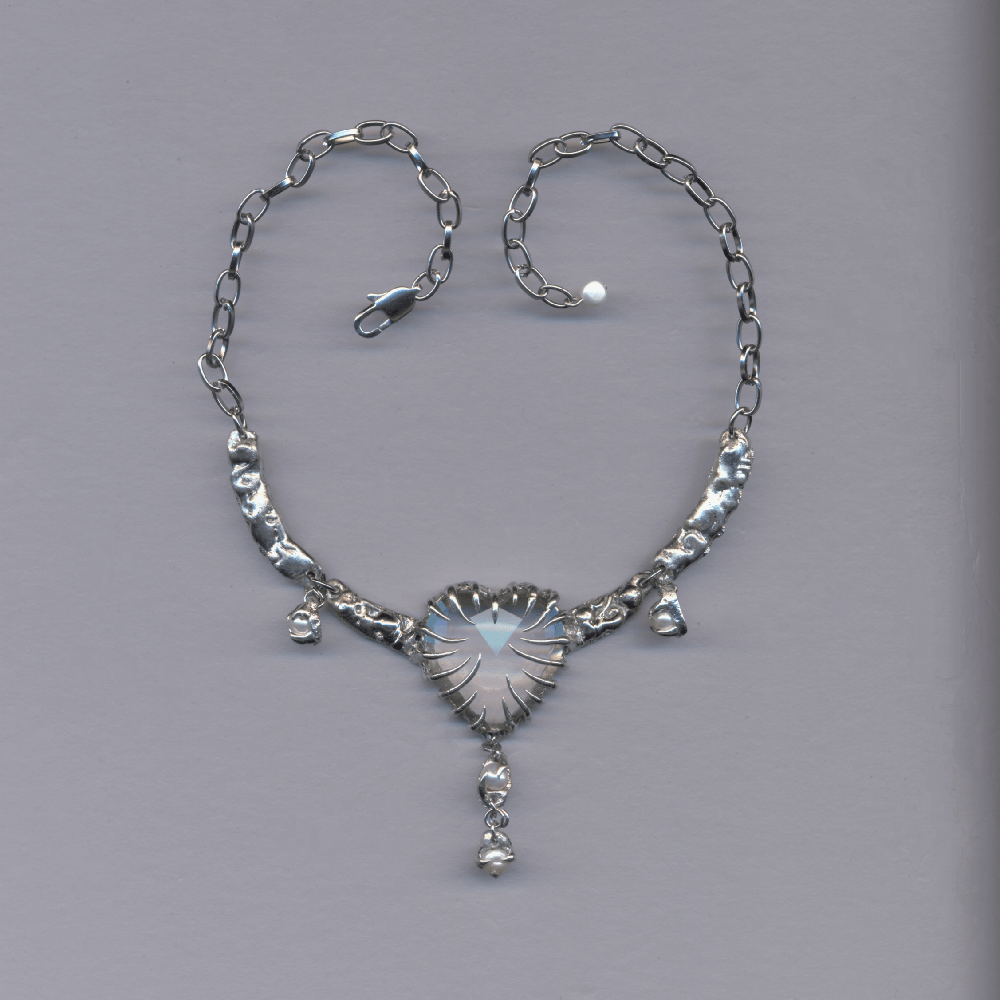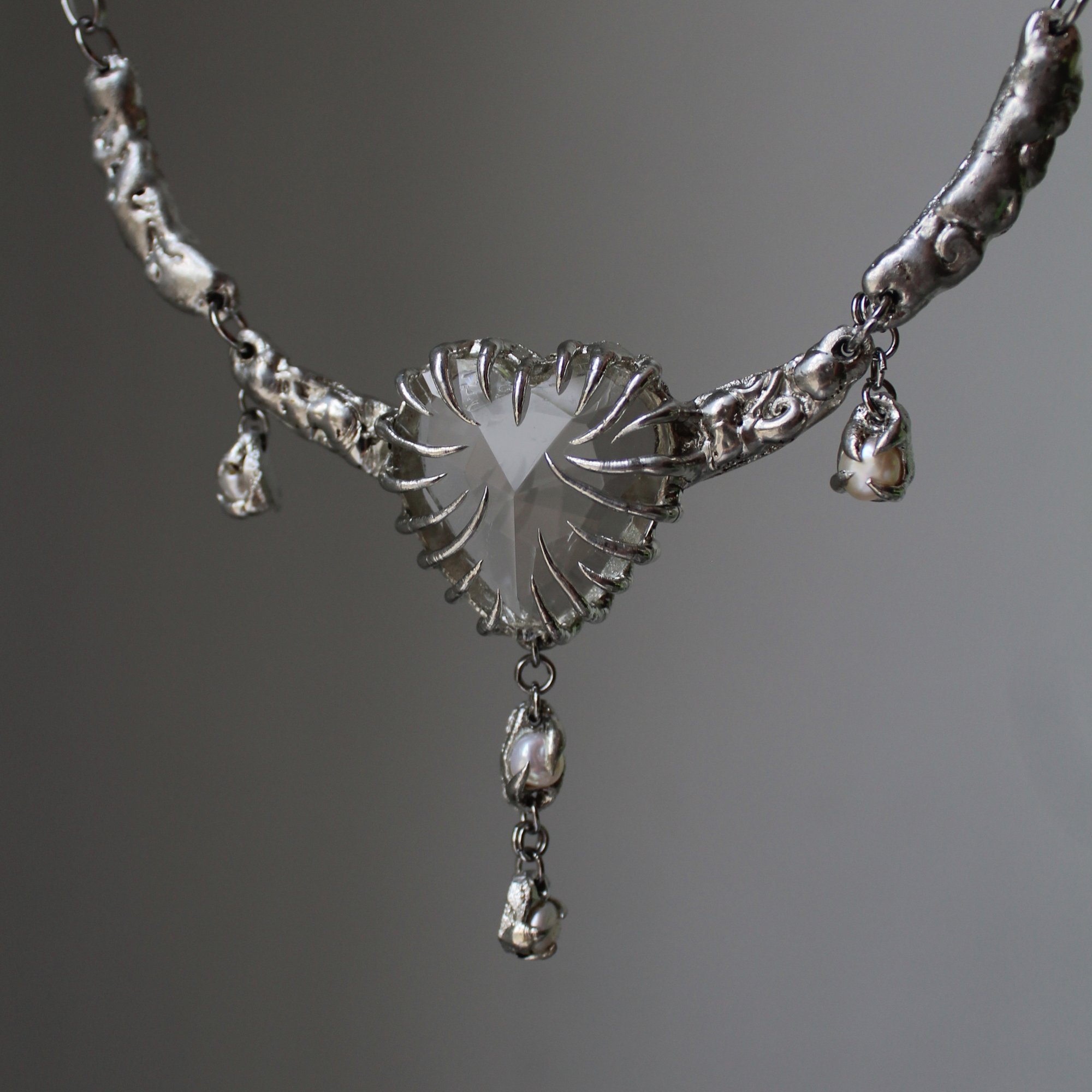 Hand-sculpted lead-free pewter choker featuring a transparent glass heart held in place by hand-soldered prongs.