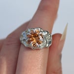 Handmade one-of-a-kind fine pewter ring with a smooth band and subtle hand-carved details, featuring a round orange cubic zirconia in a prong setting.