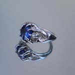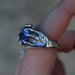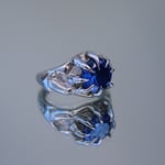 Handmade one-of-a-kind fine pewter ring with a smooth band and subtle hand-carved details, featuring a round cobalt blue cubic zirconia in a prong setting.