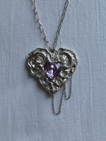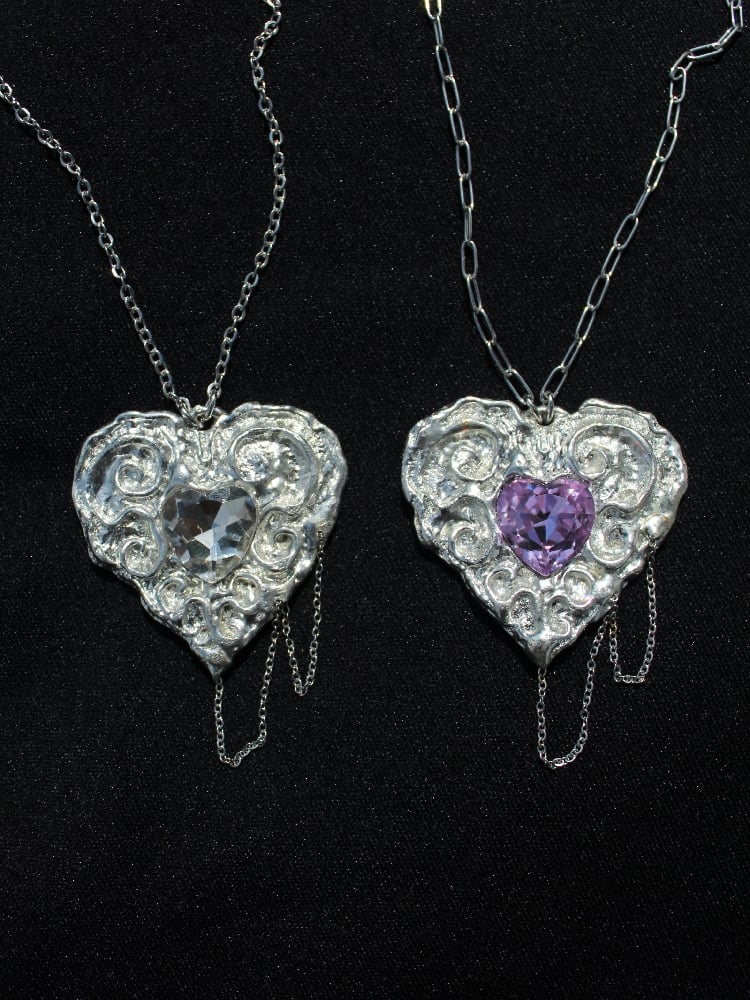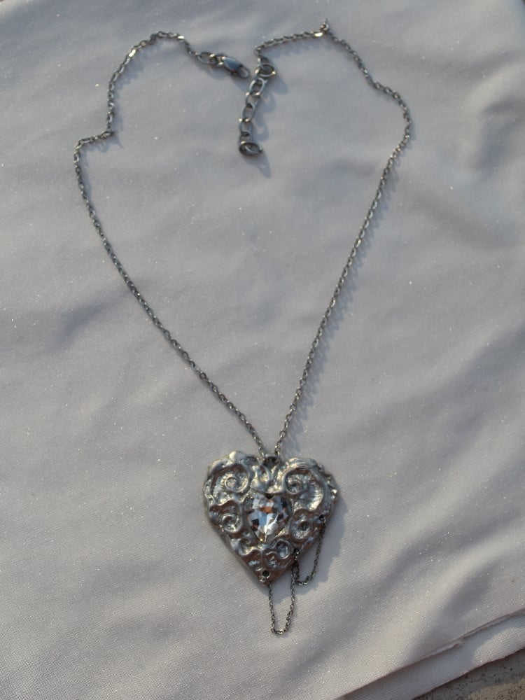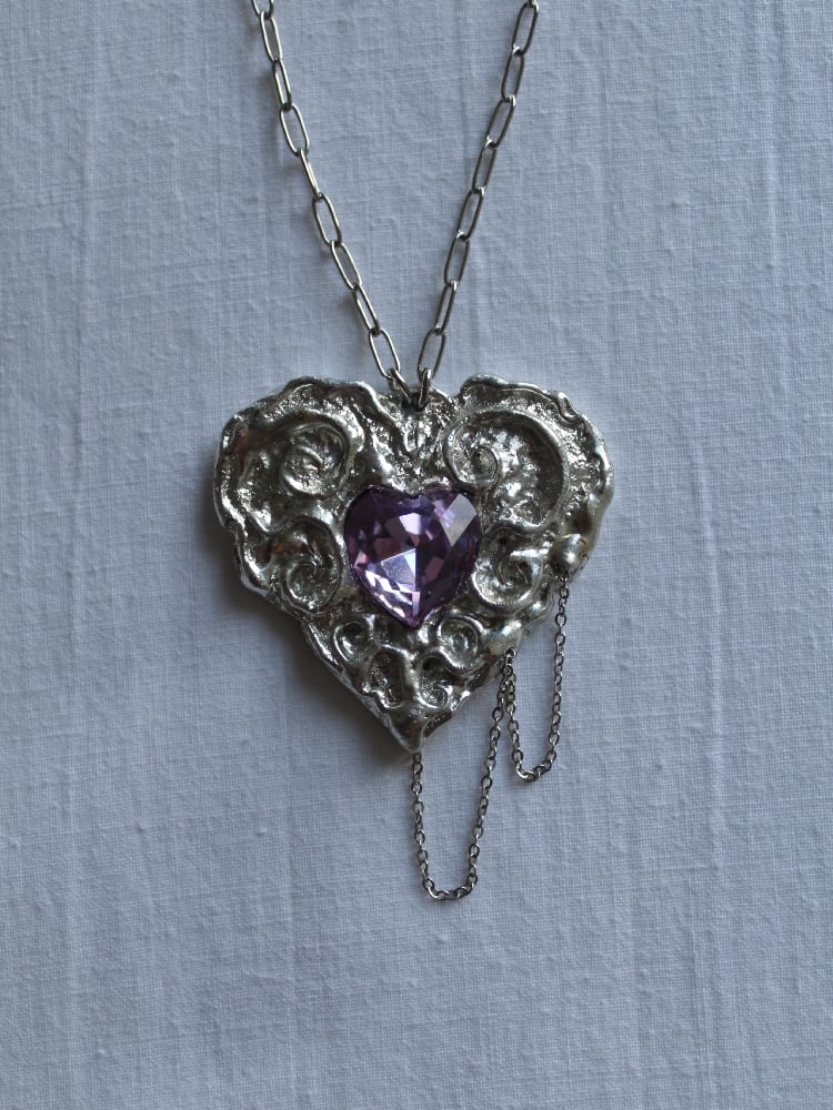 Handcarved lead-free pewter heart featuring raised spiral motifs. At the center, a glass heart shimmers with silver reflections.