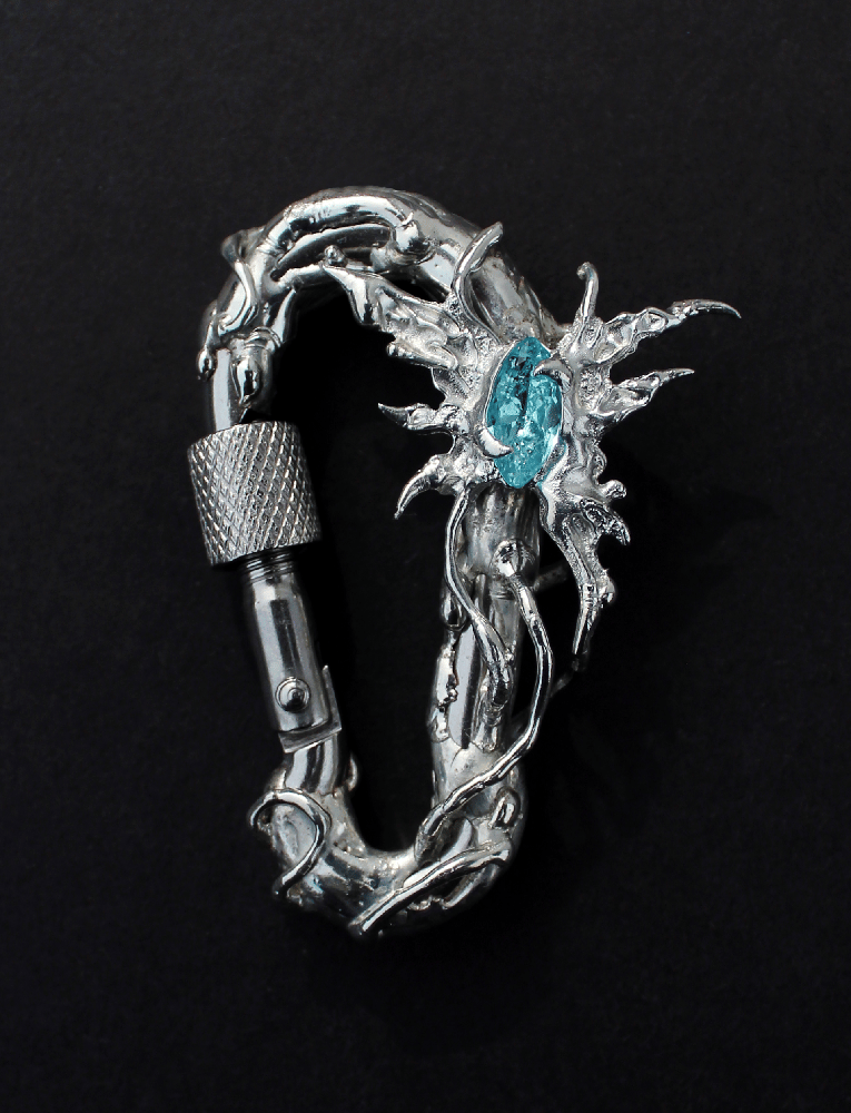An artisanal carabiner with an organic silhouette, meticulously crafted from stainless steel and lead-free pewter, and set with a sky-blue crystal marquise gemstone.