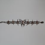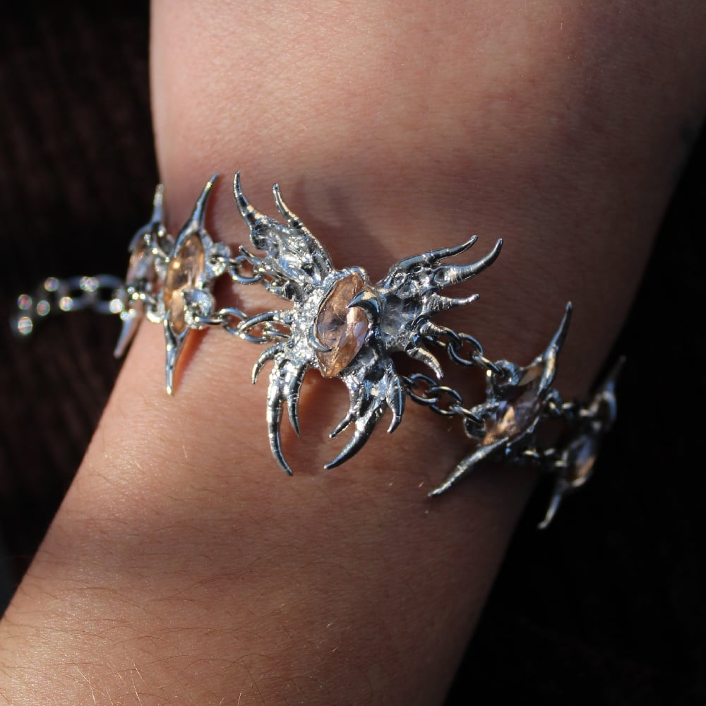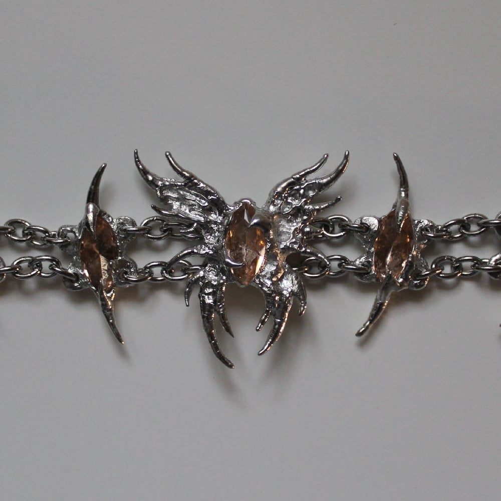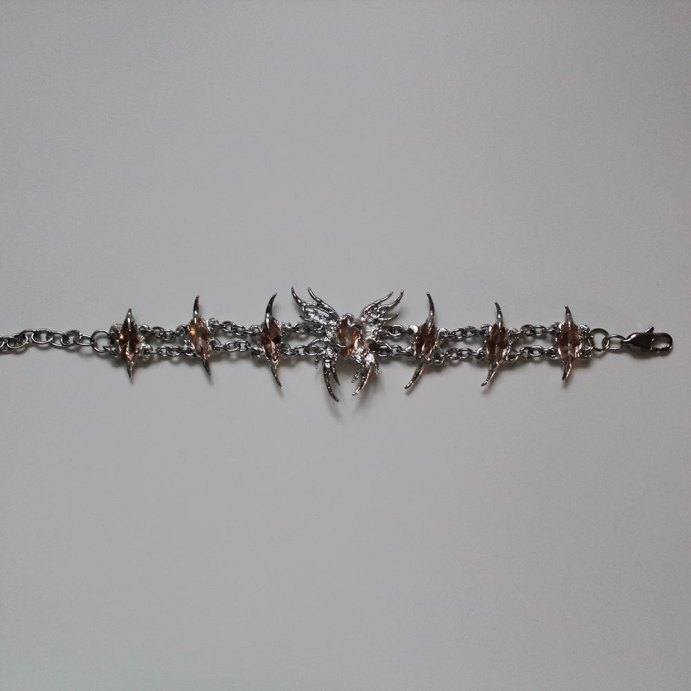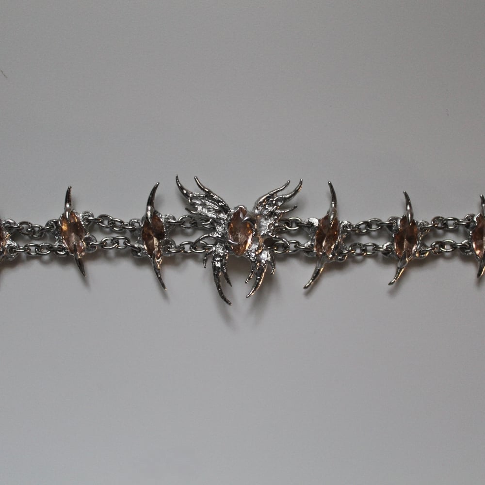 A unique pewter and stainless steel bracelet featuring a hand-sculpted butterfly and links, set with champagne marquise-cut glass gems.