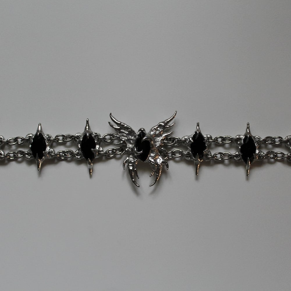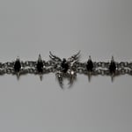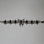 A unique pewter and stainless steel bracelet featuring a hand-sculpted butterfly and links, set with black opaque marquise-cut glass gems.