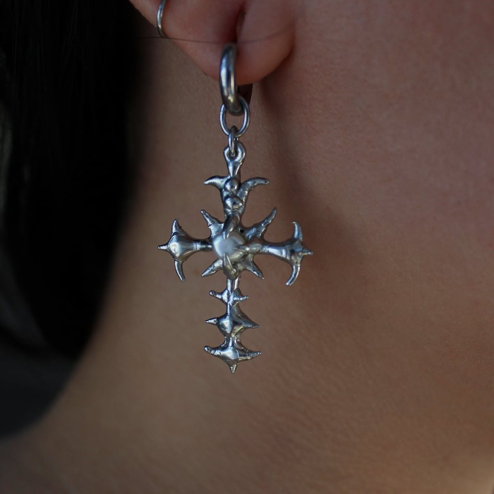 Unique handcarved lead-free pewter crosses with natural freshwater pearls. They can be worn as earrings or necklace (with a small stainless steel chain).