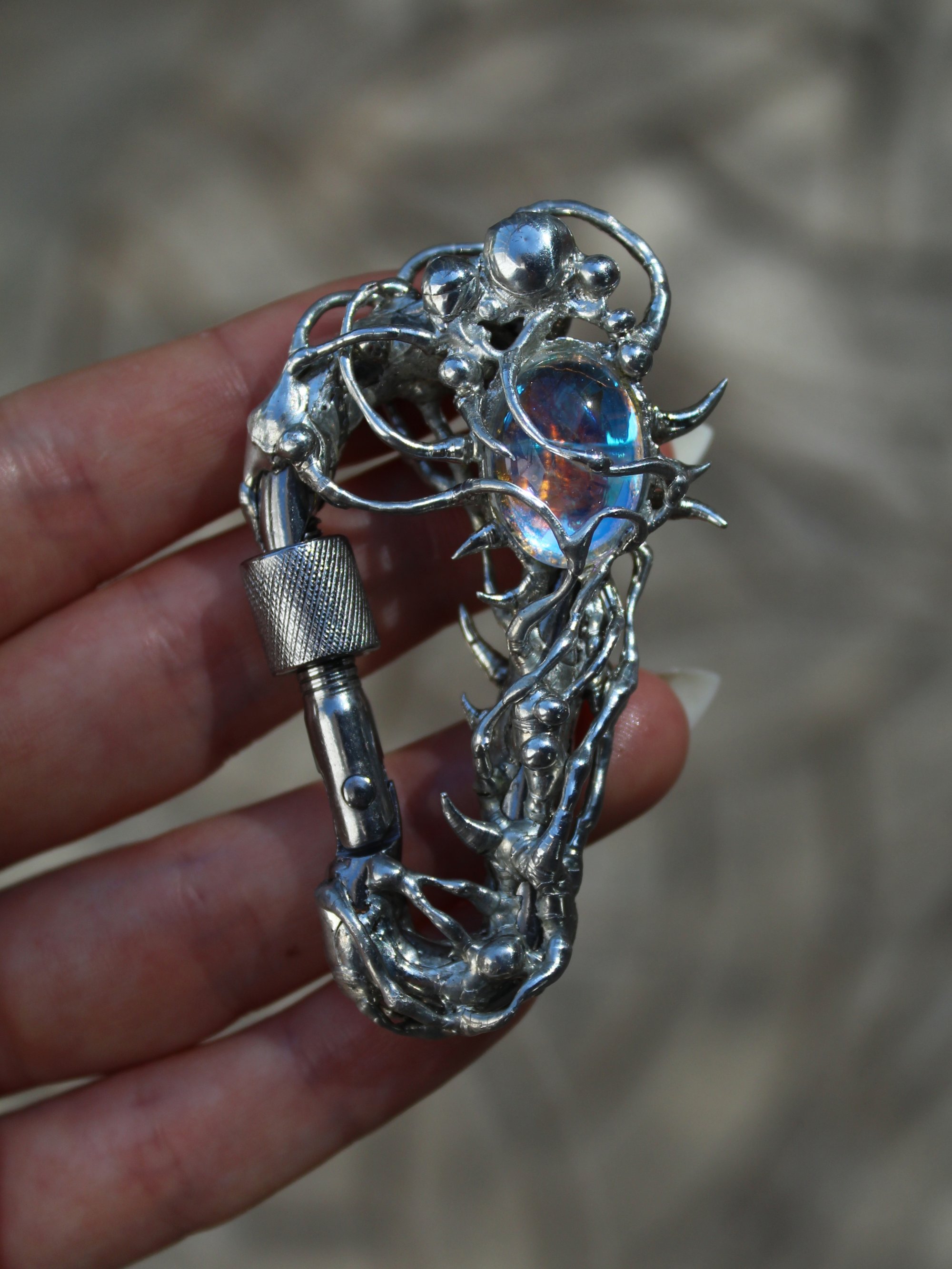 Handcrafted carabiner made using tin alloy, stainless steel & an oval glass holographic cabochon.