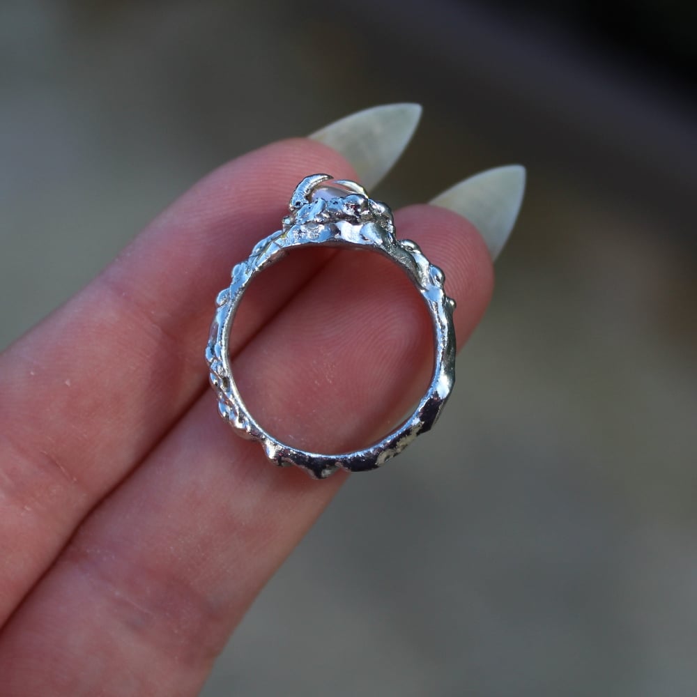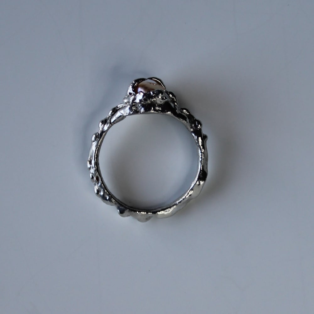 Handmade, one-of-a-kind ring crafted from fine pewter, featuring a naturally formed white pearl with soft pink undertones.