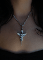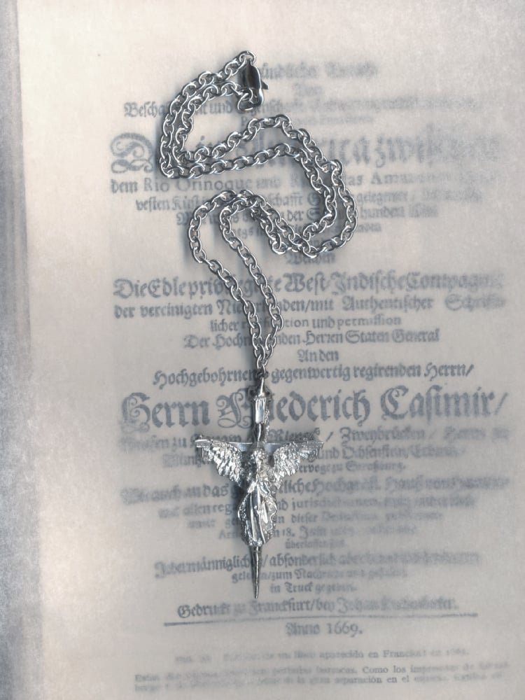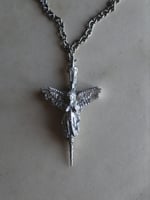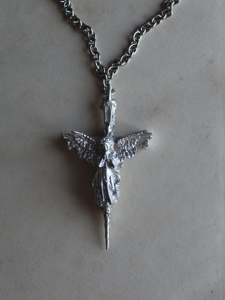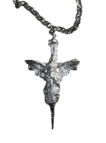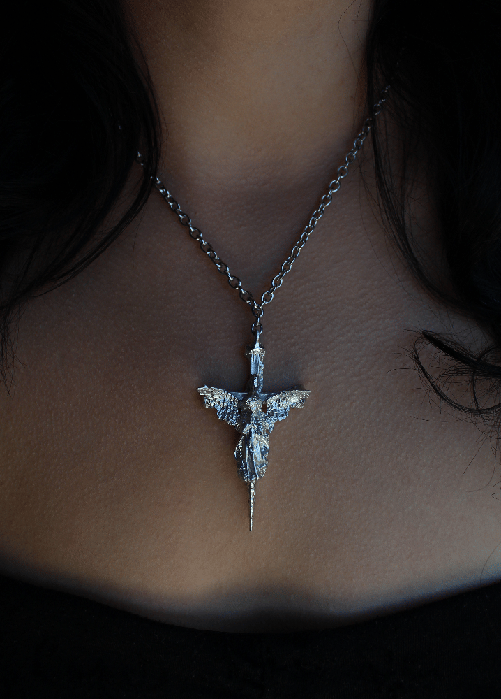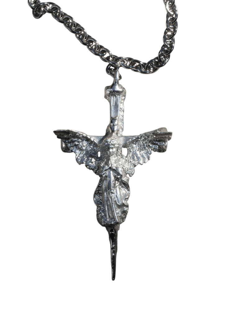 Unique handmade pewter pendant featuring an angel atop a cross, with a bold row of skulls on the reverse side.
