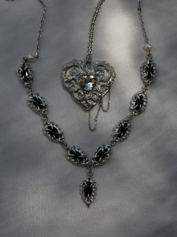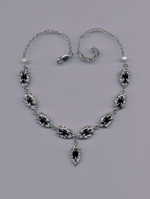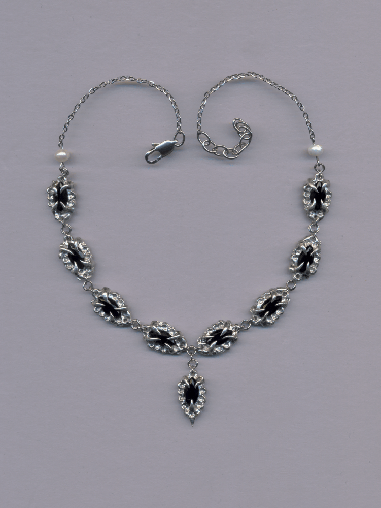 Handmade lead-free pewter necklace featuring marquise-cut black glass stones (6 x 12 mm) set in handcarved sculptural elements.