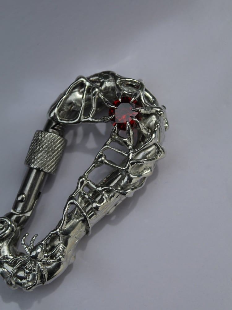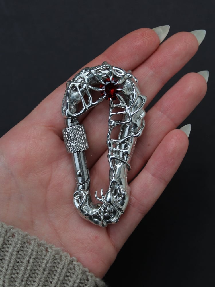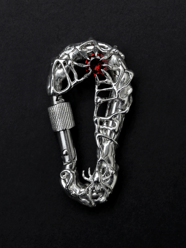 Design inspired by a spider's web. This carabiner features a finely detailed web structure, at the center of which rests a round, faceted red-orange zirconite, secured with tiny spikes.
