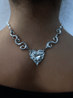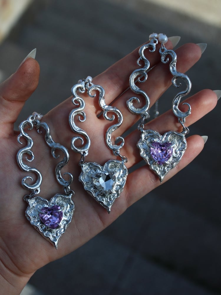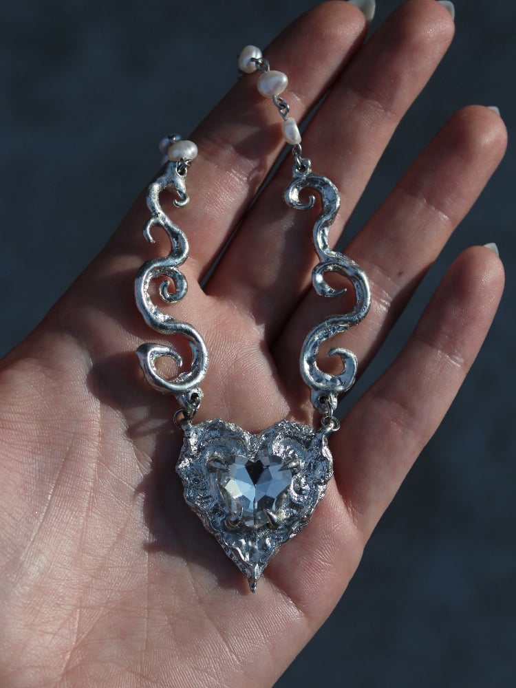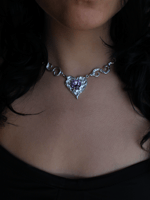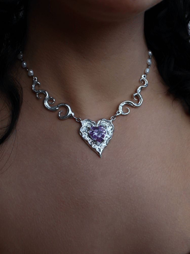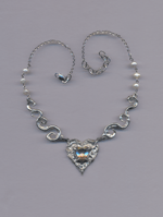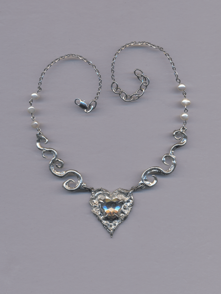Handcarved pewter necklace featuring a central heart-shaped piece with a glass heart.