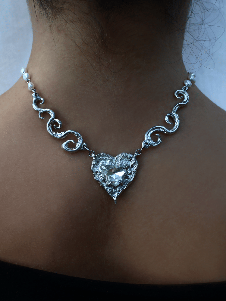Chain adorned with hand-sculpted spiral elements and genuine white freshwater pearls—each carefully selected